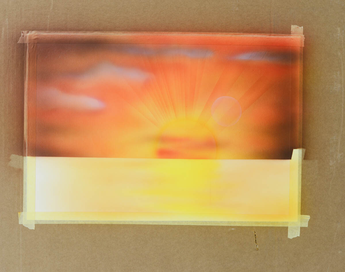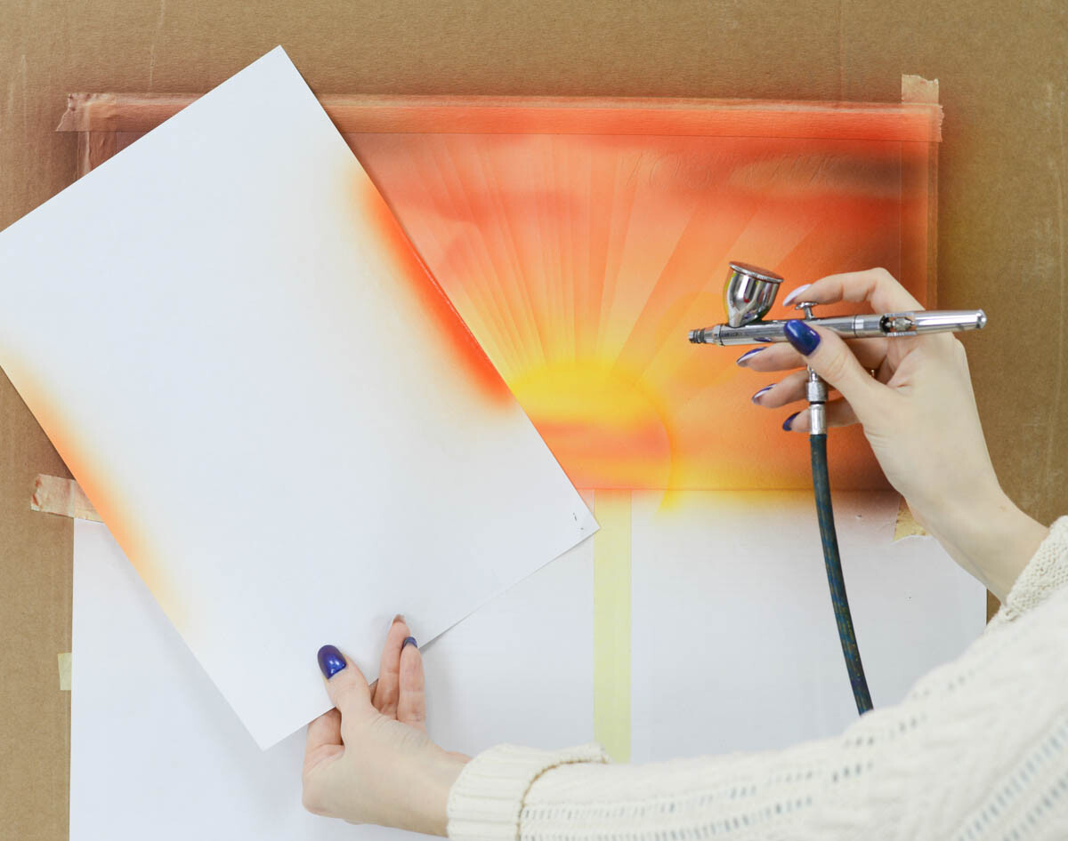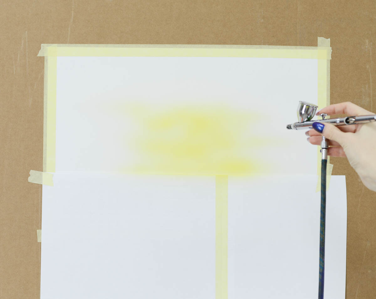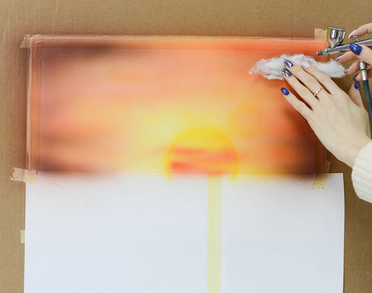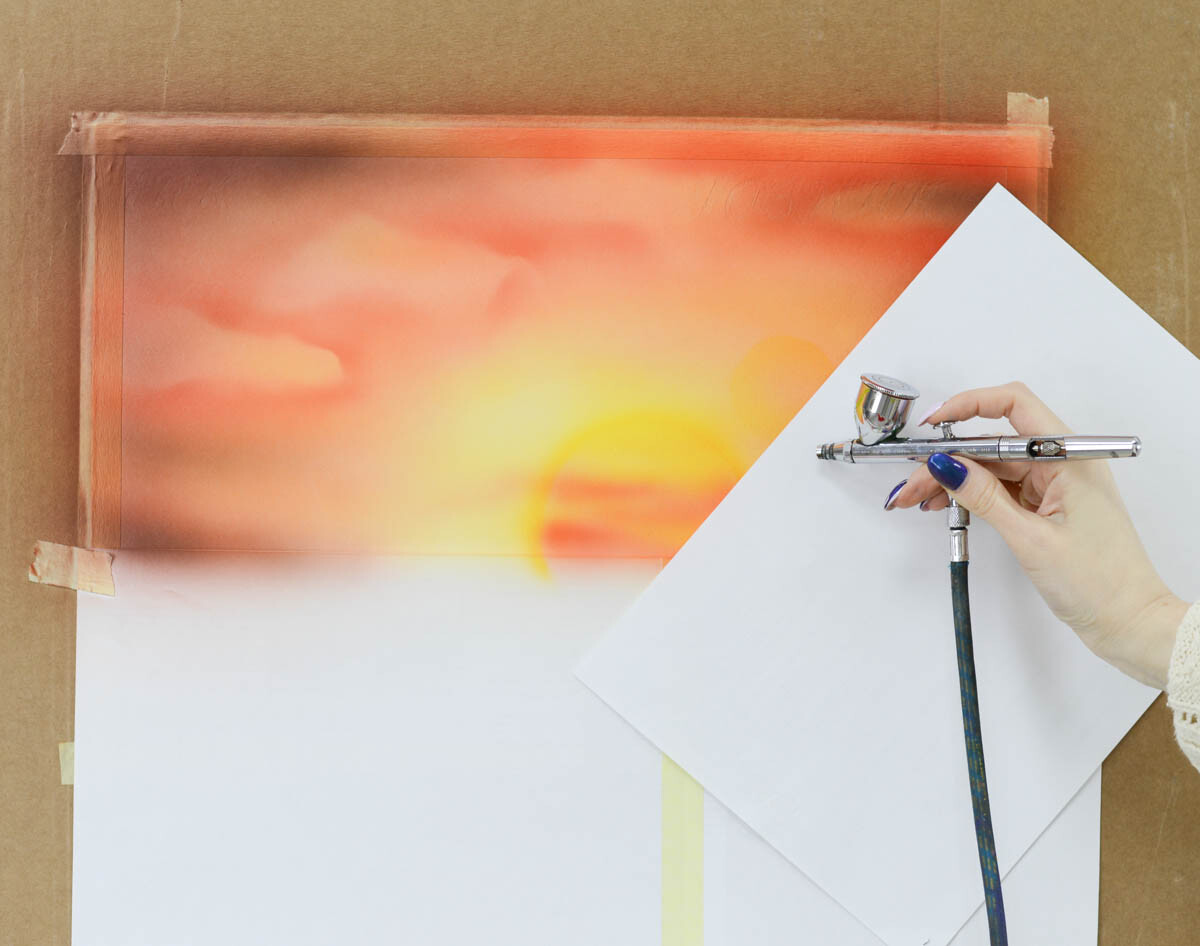 2) Наливаем желтую краску в бачок аэрографа и распыляем ее в центре картины, где будет закат.