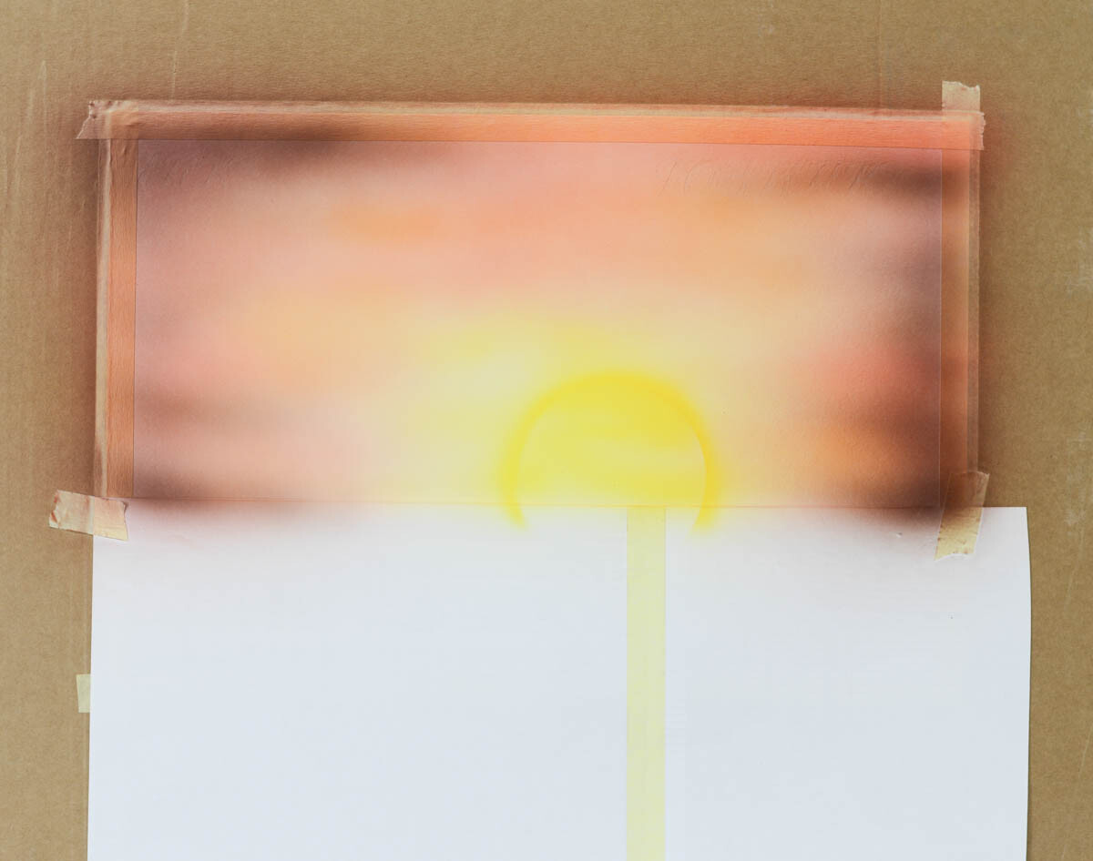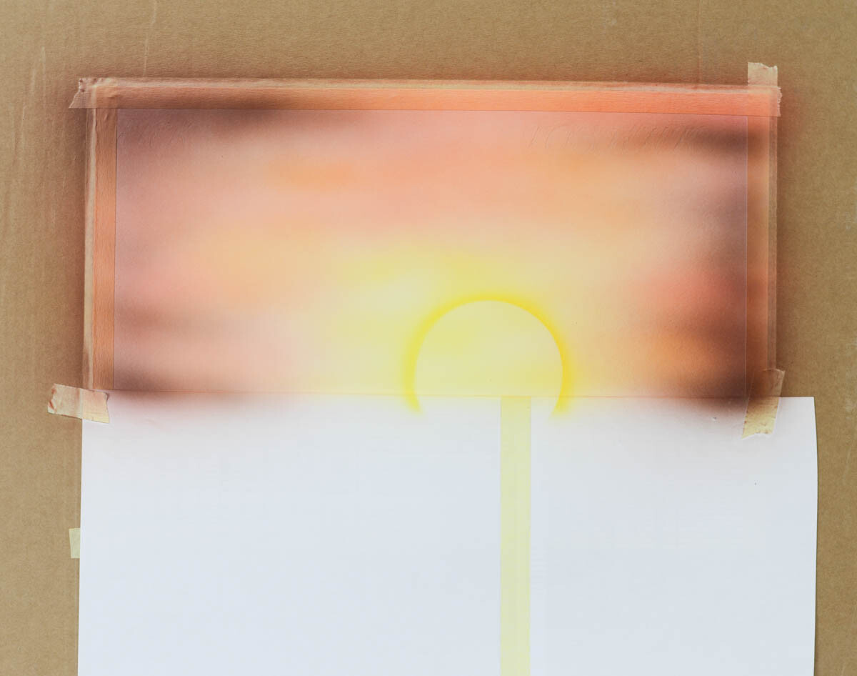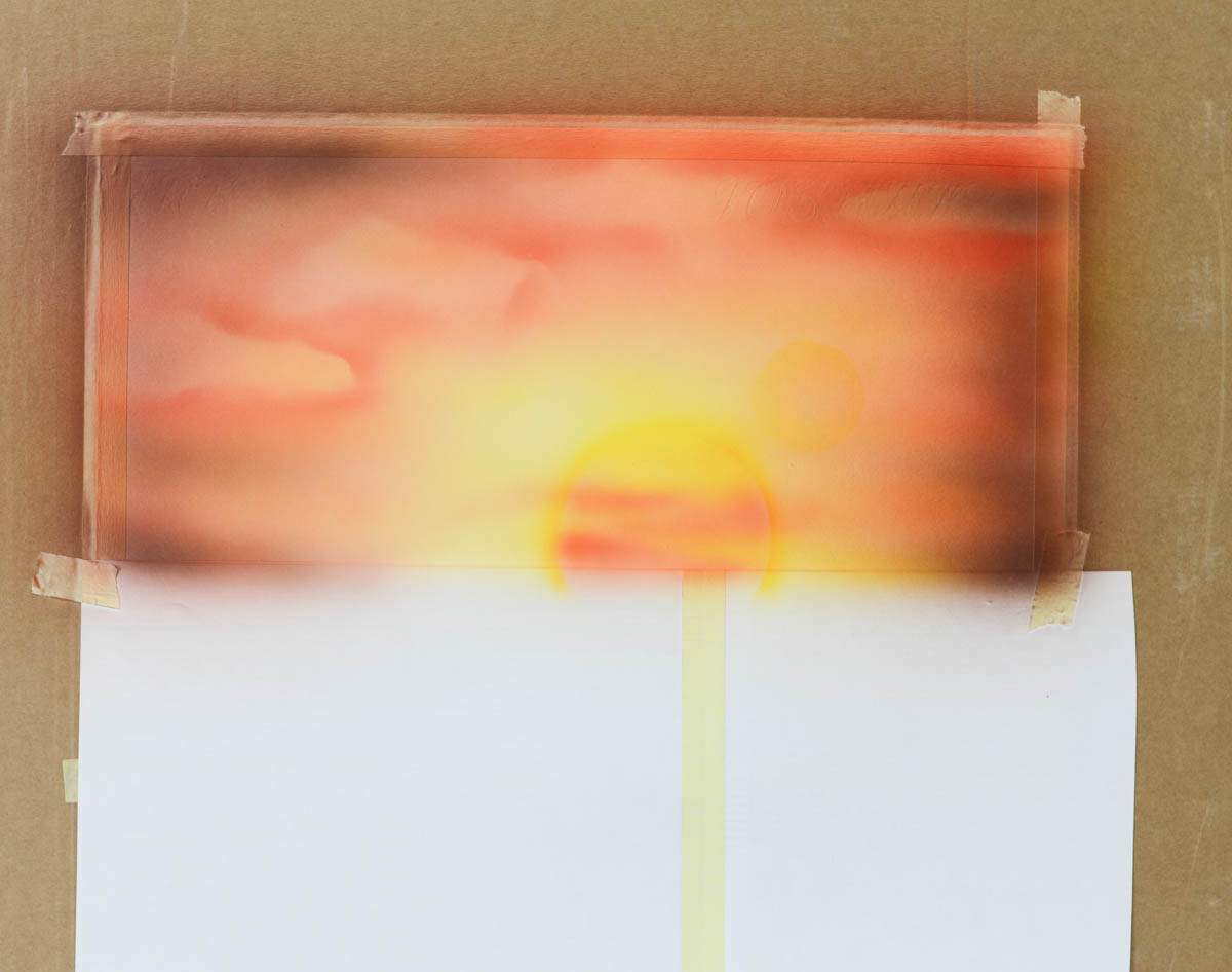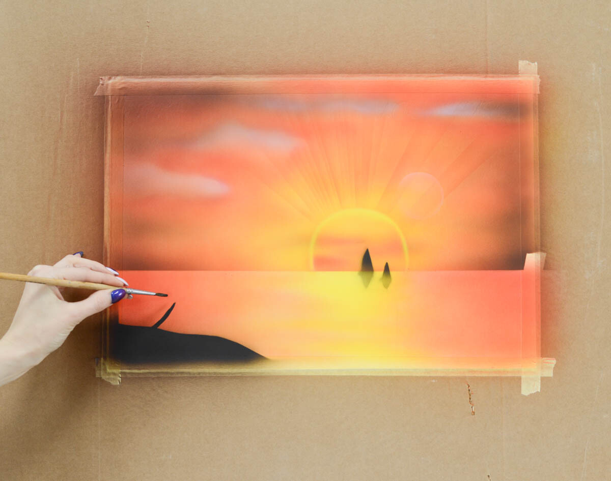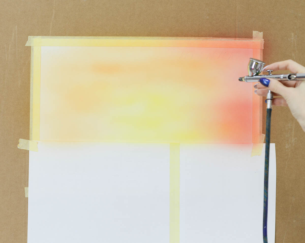 2) Наливаем желтую краску в бачок аэрографа и распыляем ее в центре картины, где будет закат.