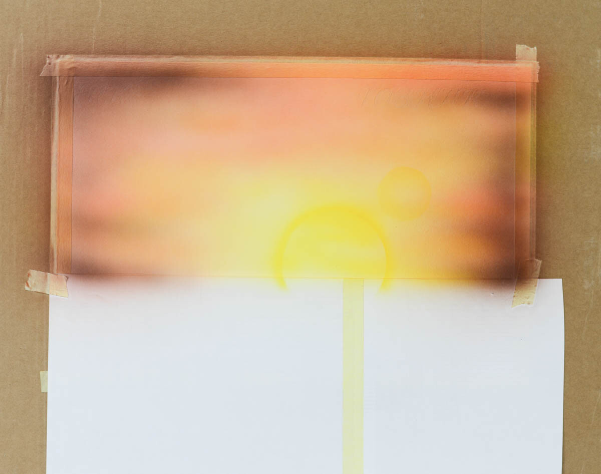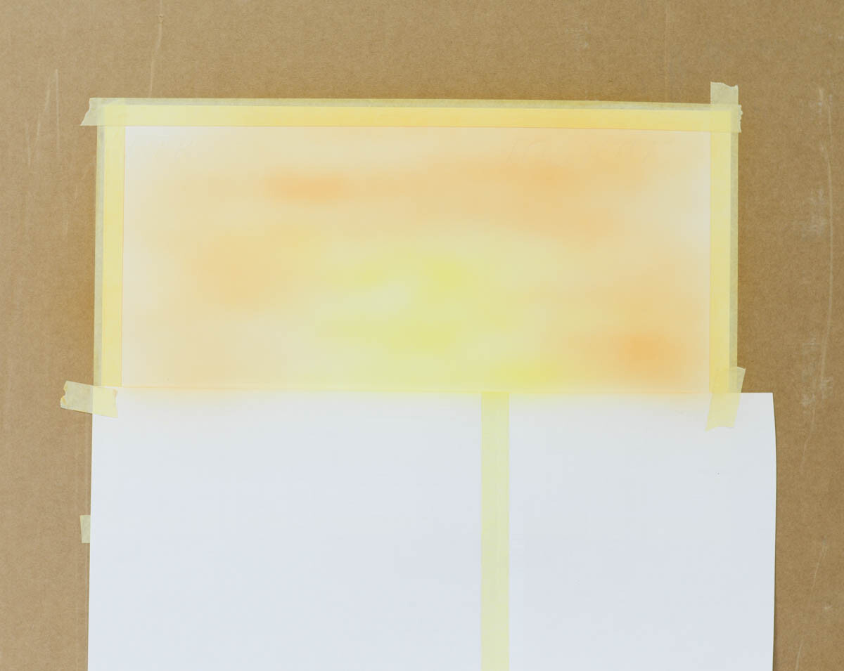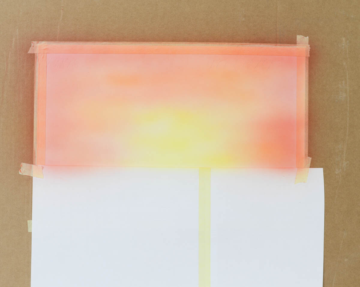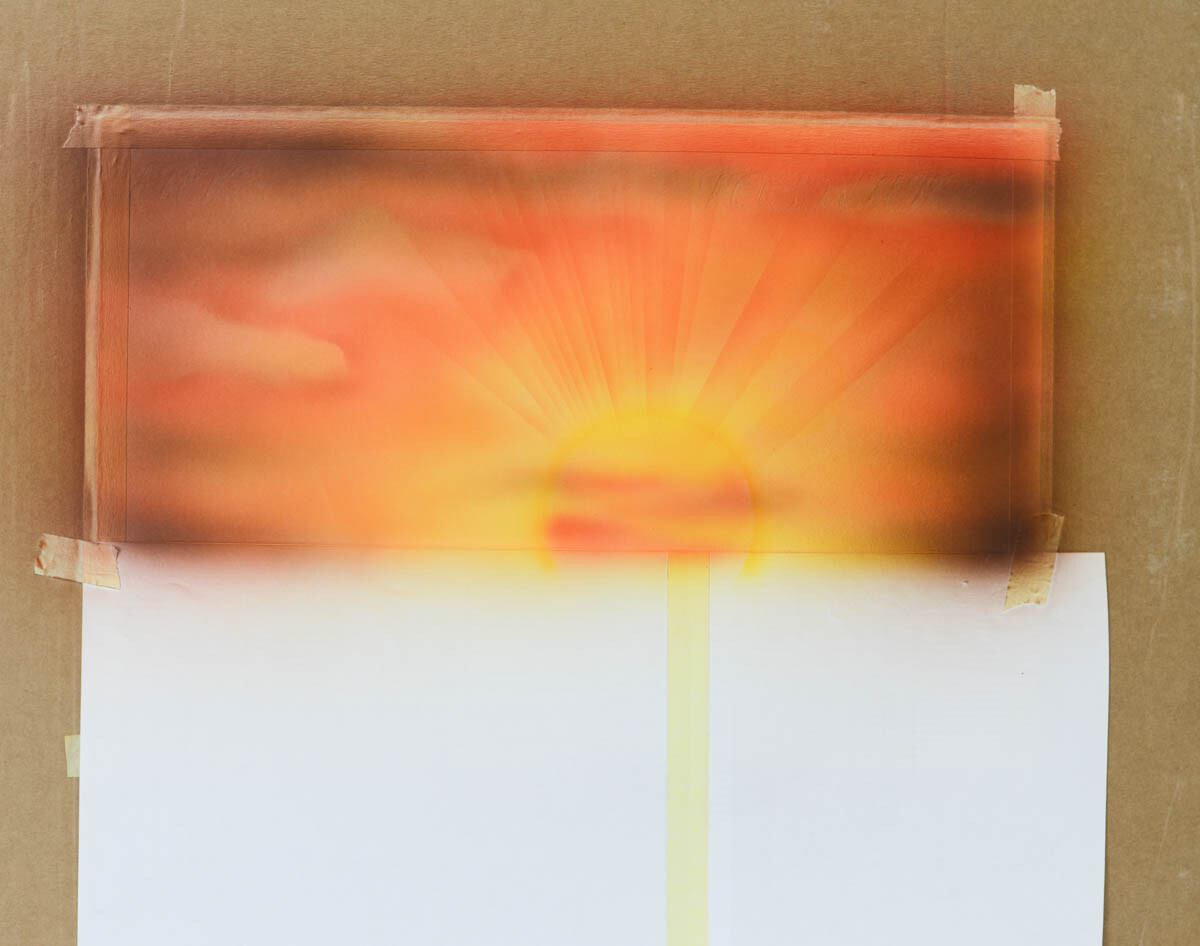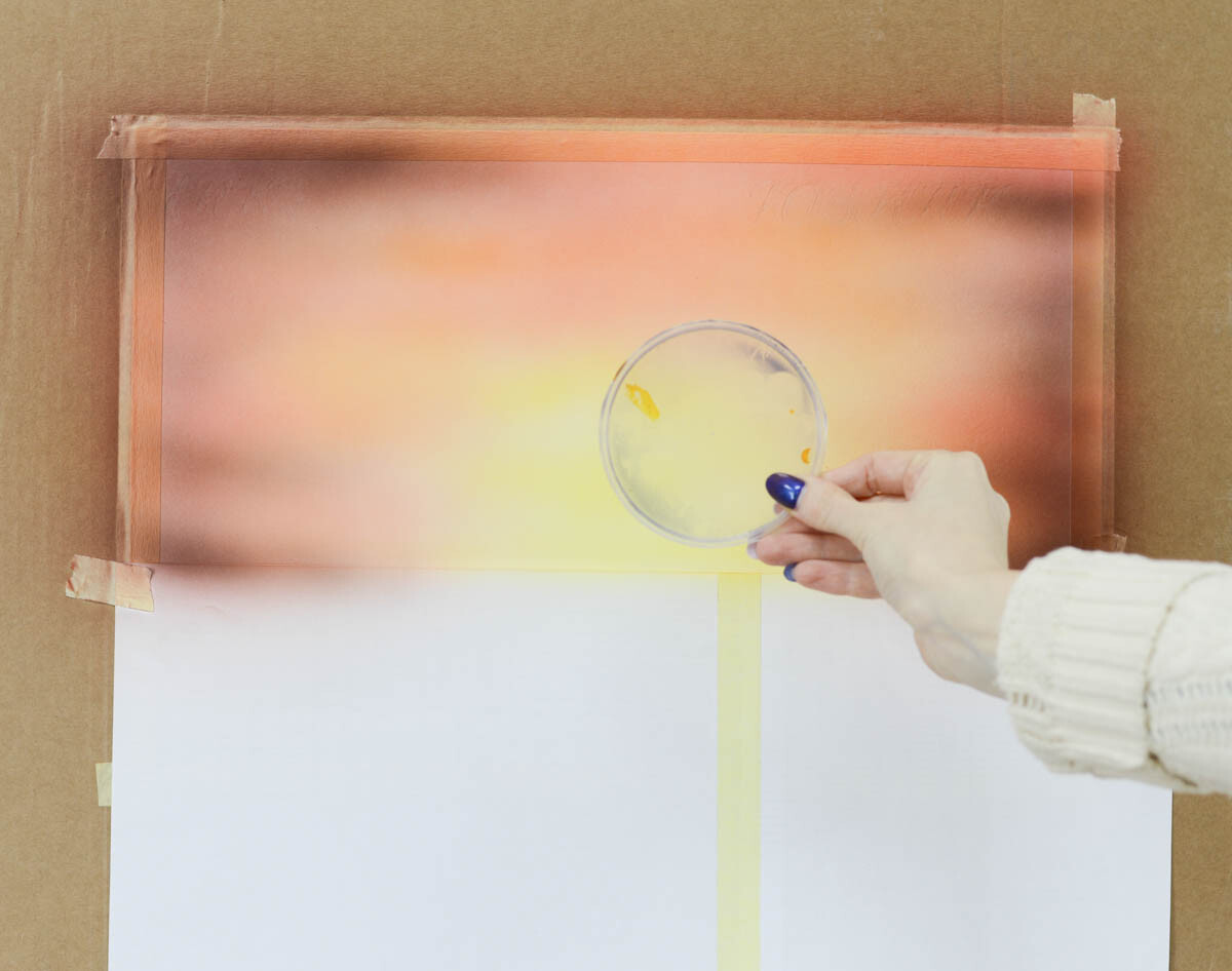 2) Наливаем желтую краску в бачок аэрографа и распыляем ее в центре картины, где будет закат.