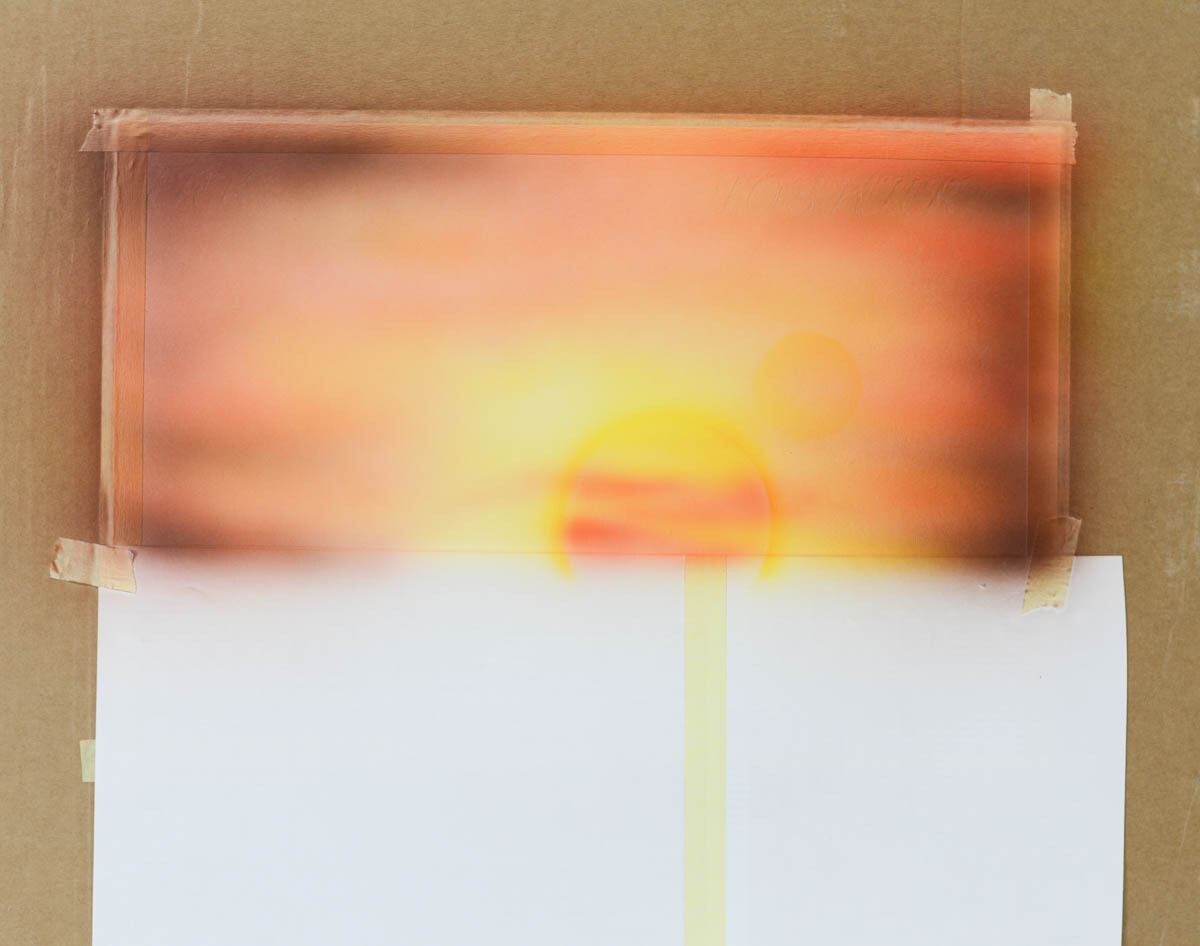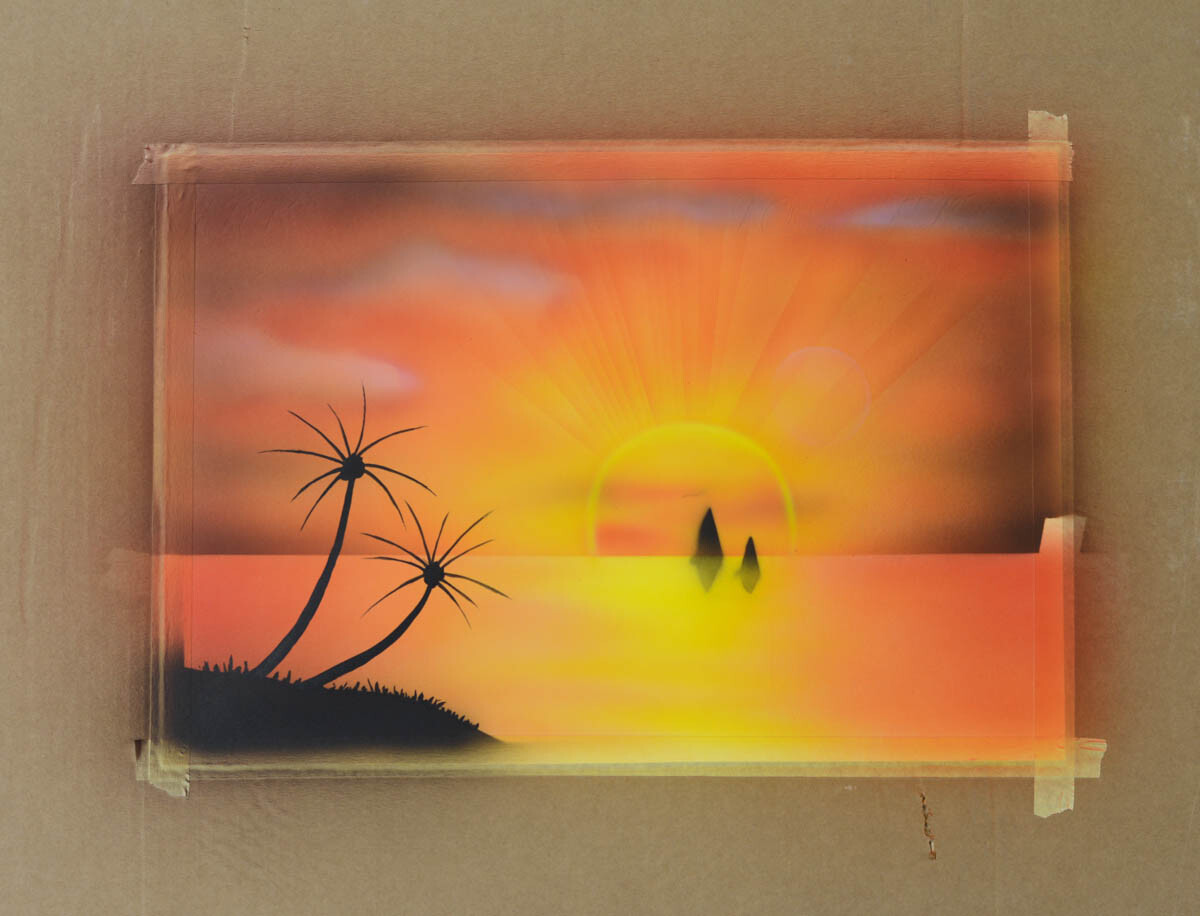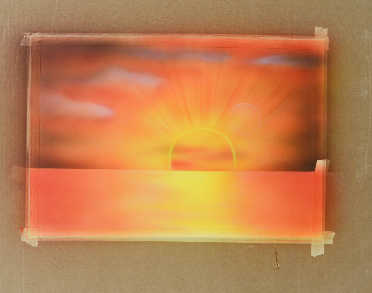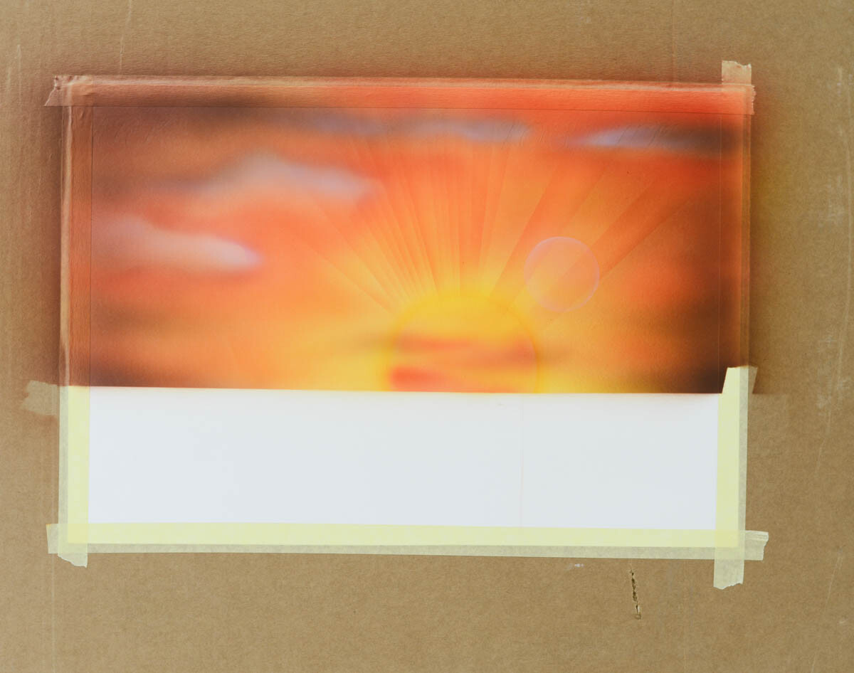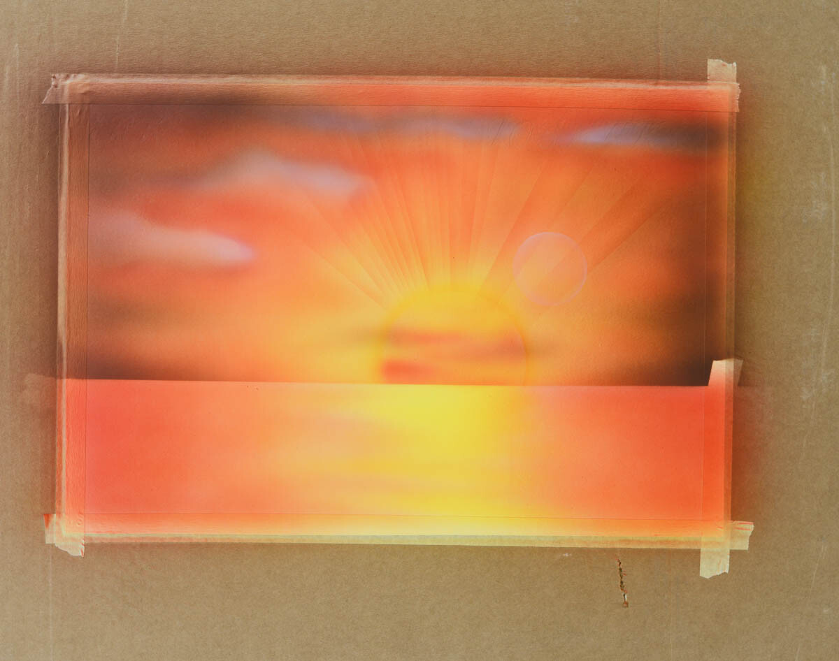 2) Наливаем желтую краску в бачок аэрографа и распыляем ее в центре картины, где будет закат.
