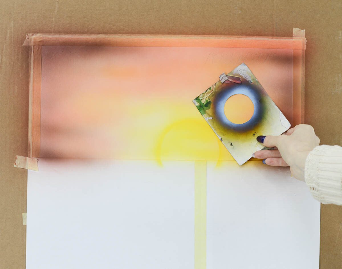 6) Берем кружок (можно вырезать из бумаги) диаметром 9,5 см, прикладываем его к картине. Сначала по контуру кружка распыляем желтую краску, затем, убрав кружок, заполняем краской середину.
