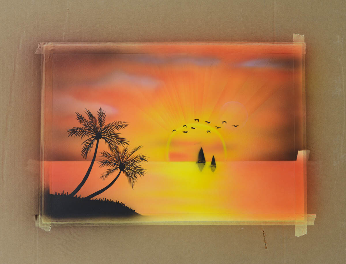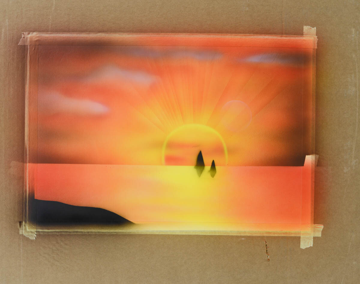 17) Вырезаем из бумаги силуэт острова и корабликов и припыляем черным цветом (снизу отражение корабликов припыляем бледно).