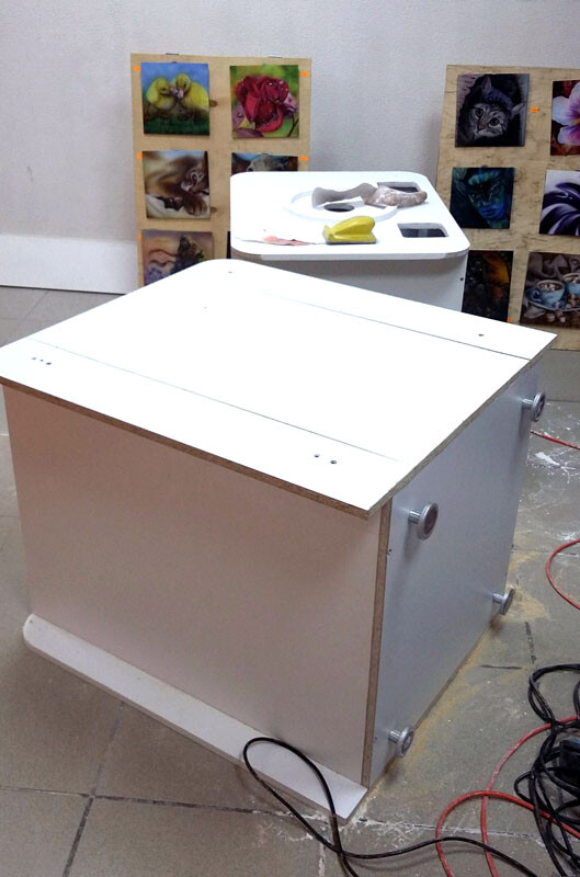 В верхней части фотобудки планировалось разместить фотокамеру, в средней - планшет, а в нижней - принтер.