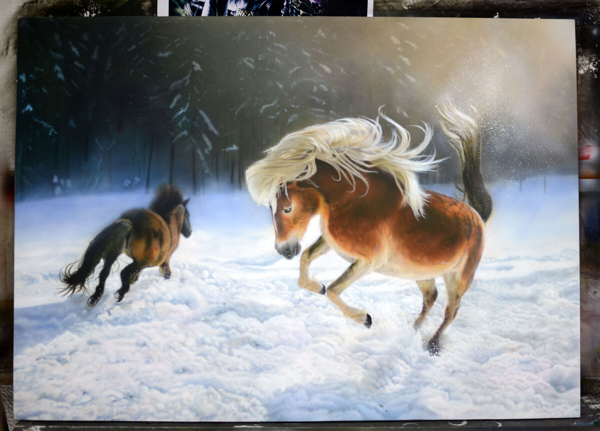 Анастасия: - Первой моей работой была картина, на которой были изображены кони на снегу! Я достаточно долго работала над ней, это была вообще моя первая большая работа как художника. При выборе картины я ориентировалась на сложность. Мне было интересно попробовать передать атмосферу: сверкающий снег, грива и движение лошадей. На мой взгляд, мне это удалось. После окончания работы над этой картиной, я расписывала телефон. Мне было довольно сложно переключиться на маленький формат крышки телефона. На мой взгляд, это важный этап в обучении - научиться работать с мелкими деталями. Кстати, это еще один огромный плюс в системе обучения в школе аэрографии Михайловой Светланы - каждый ученик может сам для себя определять, что ему важно получить от обучения, и выбирая работы «прокачивать» свои слабые стороны!