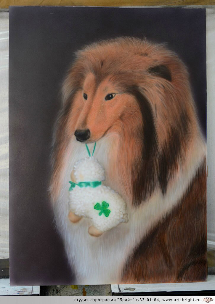 Дмитрий: - Первой моей картиной была собака колли. В зубах она держит игрушку с символом удачи - клевером. Я подумал, что в первой работе удача мне пригодится. Да, и к тому же собаки мне нравятся.