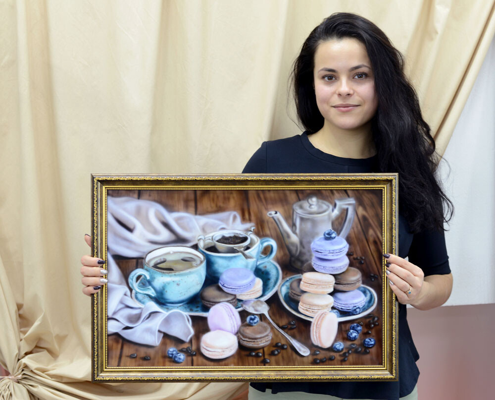 Дарья: - Первая работа - "енотик", уж больно привлекает меня этот зверёк. Сейчас она находится у моей родной сестры. Как только она ее увидела, то сразу пришла в восторг и попросила меня сделать ей подарок. И, конечно, я не смогла отказать :). Вторая работа - натюрморт, кофейные чашечки с макарунами. Эту картину я подарила бабушке на день Рождения.