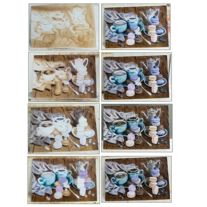 Дарья: - Больше всего мне запомнилась очень тёплая атмосфера в студии и первые два дня занятий. Очень болели пальцы от освоения аэрографа, но это только в начале, когда отрабатывала первые упражнения - вертикальные и горизонтальные палочки :)
