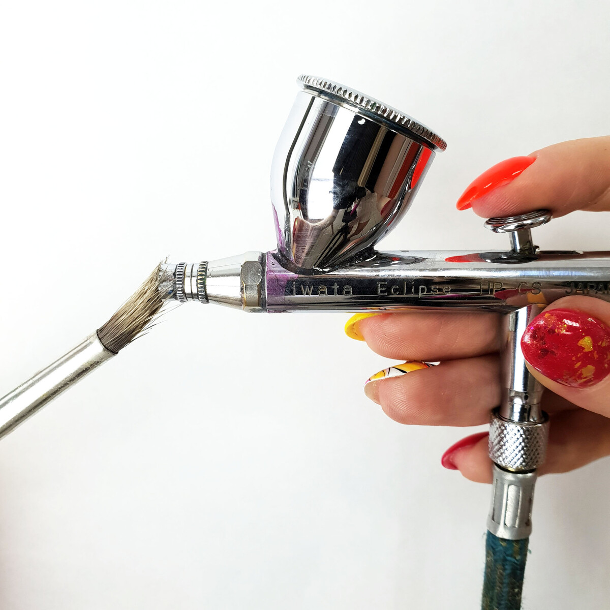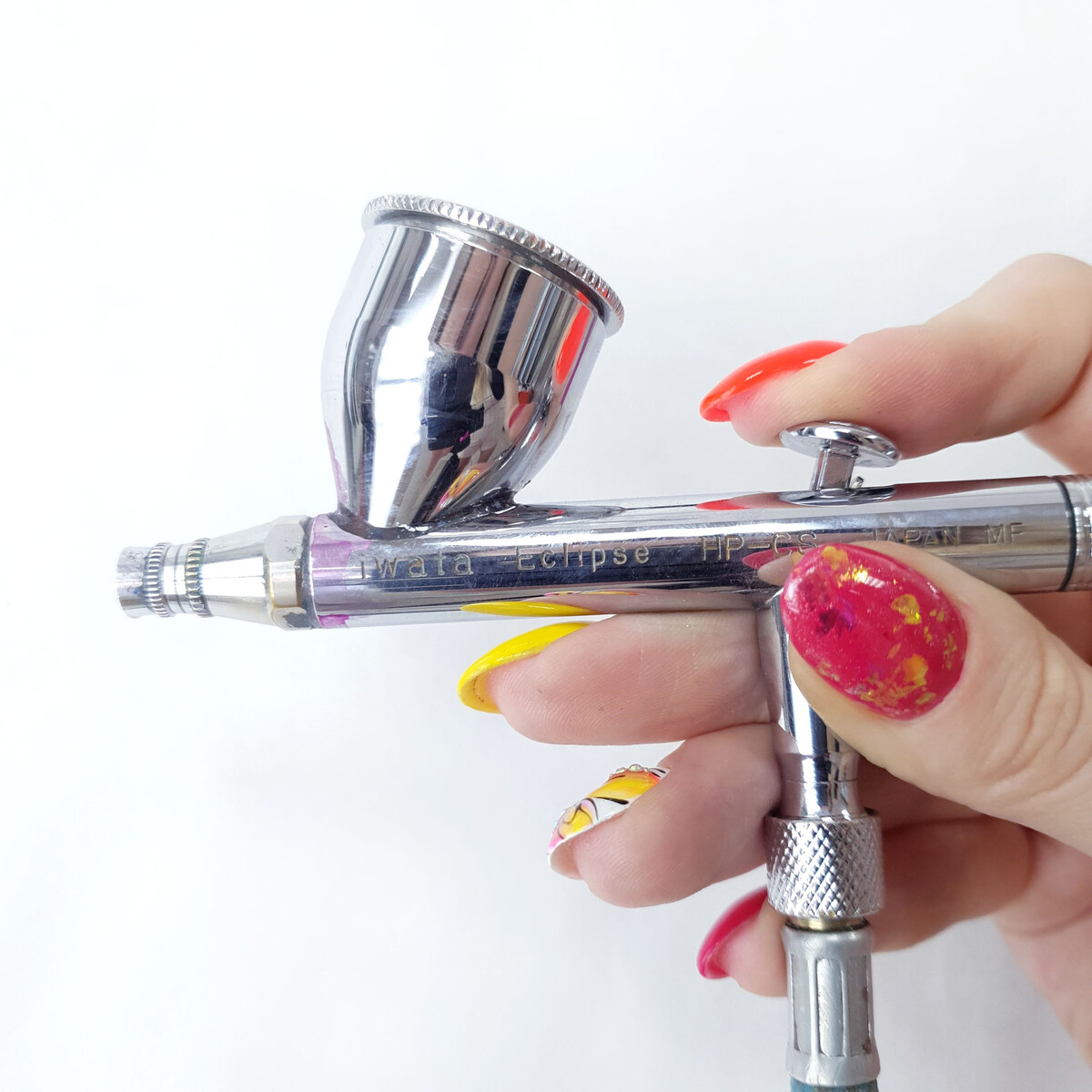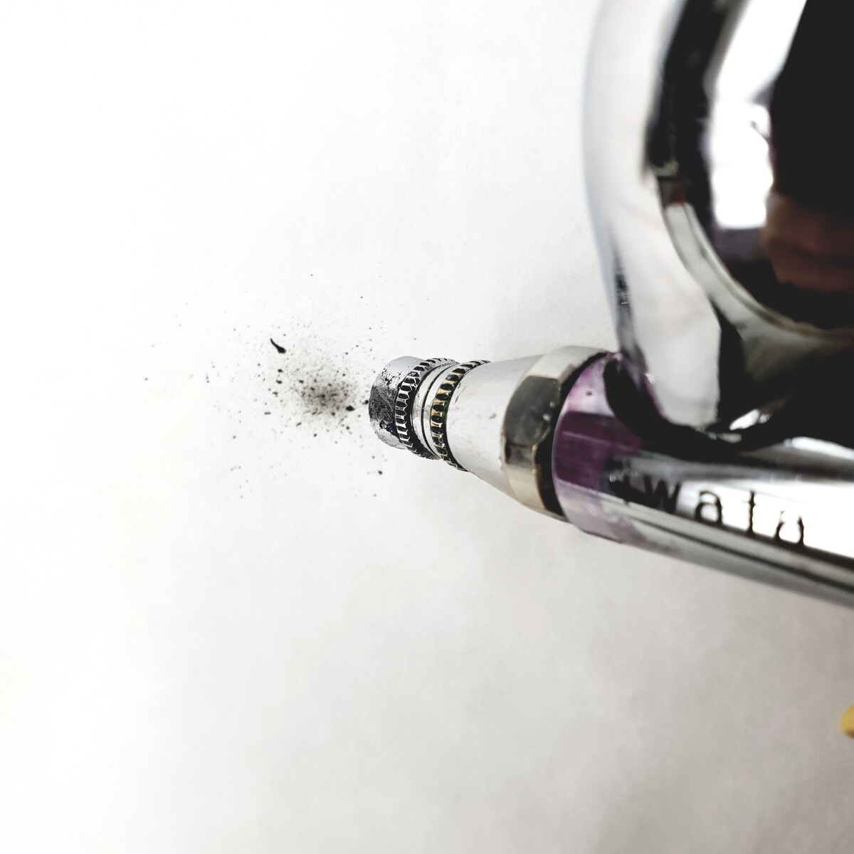 Совет: прежде чем рисовать на рабочей поверхности, пустите воздух на черновик, а затем приступайте к рисованию или прочистите щетиной носик аэрографа.